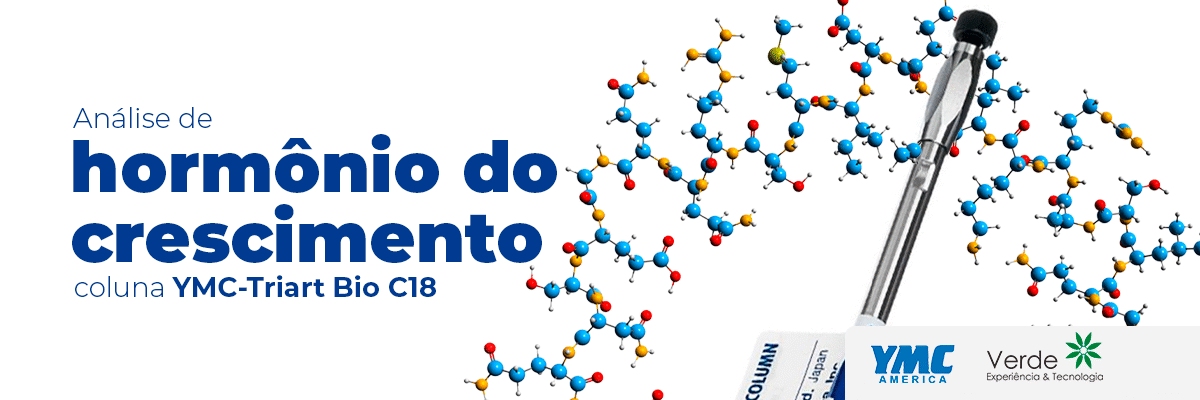 No que diz respeito ao desenvolvimento de biomedicamentos para o tratamento de deficiência do HCH, o desafio consiste em sua susceptibilidade à degradação físico-química. Proteínas são sensíveis a fatores como temperatura, luz, agentes oxidantes, pH, congelamento, processos mecânicos, umidade residual e excipientes na formulação. Para isso, é necessário métodos analíticos que identifique, separe e quantifique impurezas ao longo do processo de caracterização e controle de qualidade.4 Tendo isso em vista, a YMC apresenta uma aplicação utilizando a coluna YMC-Triart Bio C18 para a quantificação do hormônio do crescimento humano, empregando fase móvel composta por Acetonitrila/Água/TFA e detecção por UV-VIS.