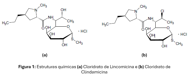 As estruturas químicas da Lincomicina e da Clindamicina nas formas de Cloridrato são apresentadas na Figura 1.