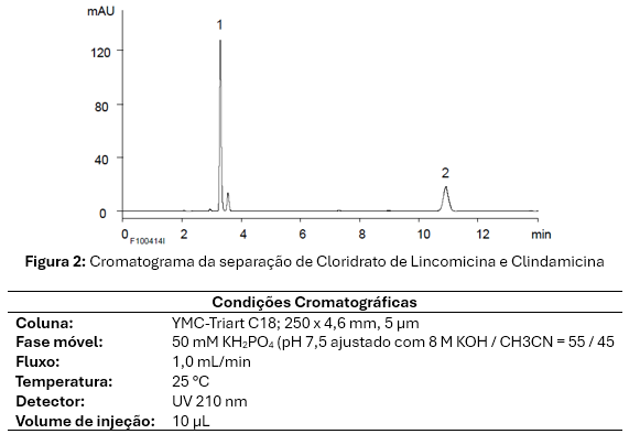 O método utilizou a coluna YMC-Triart C18 com dimensões de 250 × 4,6 mm, partículas de 5 µm e poros de 12 nm. A fase móvel consistiu em uma mistura de 50 mM de fosfato de potássio monobásico e acetonitrila na proporção 55/45, com o pH da solução de fosfato ajustado para 7,5 utilizando Hidróxido de Potássio (KOH) 8 M. Nessa condição de pH, é necessária uma coluna como a Triart C18, que apresenta estabilidade adequada. As demais condições cromatográficas estão detalhadas logo abaixo do cromatograma da Figura 2.