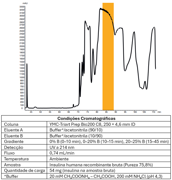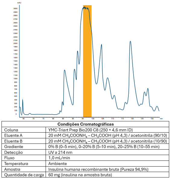 Para atender às exigências desse processo complexo, a YMC desenvolveu a fase estacionária YMC-Triart Prep Bio200 C8, projetada para a purificação de peptídeos, incluindo a insulina. Um método otimizado para a purificação de insulina utilizando esta coluna foi desenvolvido em cooperação com fabricantes de insulina, com base em dados reais de produção. O resultado é uma fase cromatográfica que combina alta eficiência, excelente reprodutibilidade e resistência química, permitindo ganhos significativos em rendimento, pureza e estabilidade do processo.