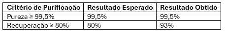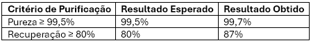 Os critérios de aceitação foram significativamente superados, com recuperação de 93% e pureza de 99,5%.