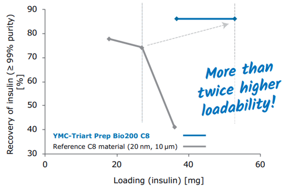 Além disso, testes comparativos com uma fase C8 convencional (10 µm, poro 200 Å) demonstraram que a YMC-Triart Prep Bio200 C8 permite mais de 100% de carga adicional mantendo a mesma pureza, dobrando a produtividade do processo.